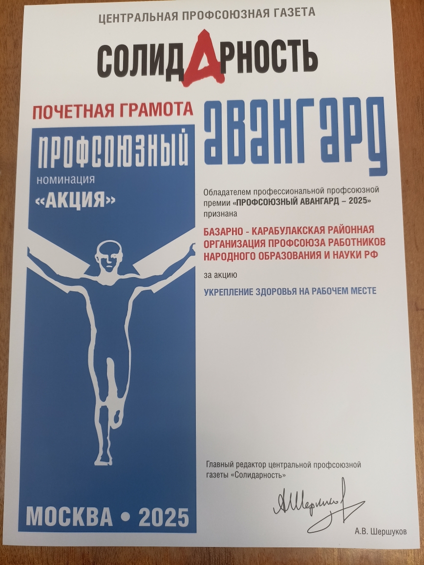 Базарно-Карабулакская организации профсоюза работников народного образования и науки РФ стала победителем конкурса " Профсоюзный Авангард -2025а номинации " Акция" Укрепления здоровья на рабочем месте". Поздравляем!